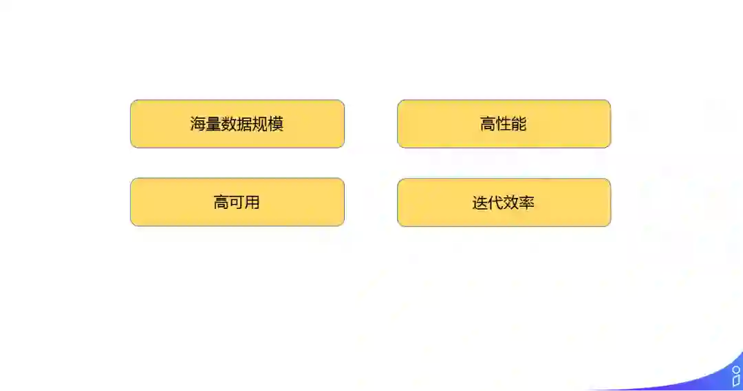 接下来会从海量数据规模、高性能、高可用、迭代效率四个方面分别谈一下我们的解决思路和实践经验: