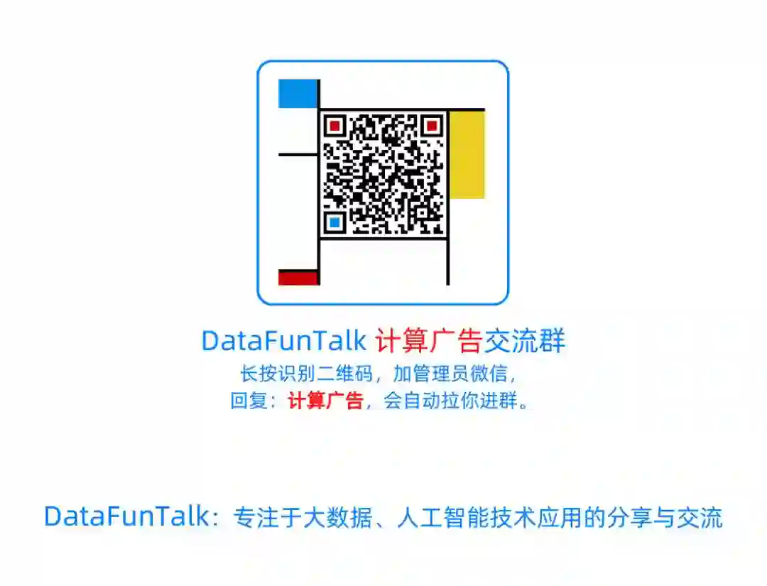 欢迎加入 DataFunTalk 计算广告交流群,与小伙伴们一起讨论计算广告相关问题。加管理员微信 ( 微信号:DataFunTalker ) 或识别下方二维码,回复:计算广告,会自动拉你进群。