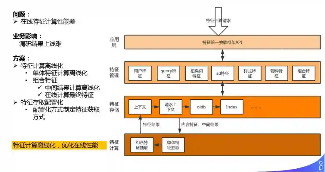 再有就是特征逻辑复杂,在线抽取性能差的问题,这导致了我们的很多特征技术即使调研完成后很有效果,也因为在线性能的原因难于全量上线。