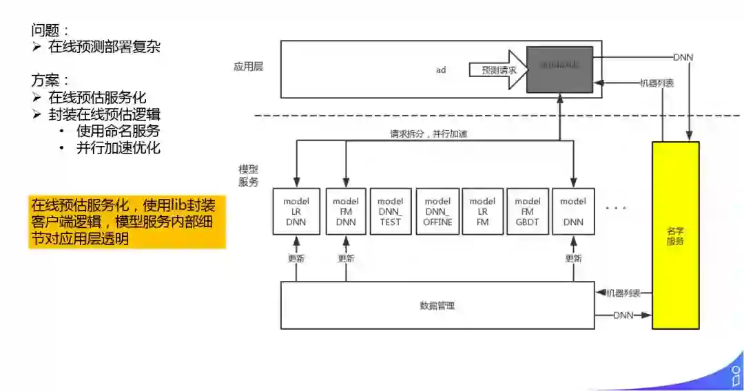 最后就是在线预估部分,我们通过 lib 封装了在线预估的逻辑,内部使用名字服务确定模型到具体机器的依赖,并且做了并行等加速优化,将在线预估以服务化的方式输出,对应用方屏蔽了具体部署的细节。