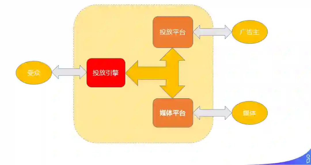 上图明确了投放引擎在整个广告平台中所处的位置。可以看到投放引擎属于偏前端 ( 面向受众 ) 的位置,直接向广告受众 ( 网民 ) 投放广告,进而产生收益。可以说投放引擎的效果直接影响广告平台的收益。