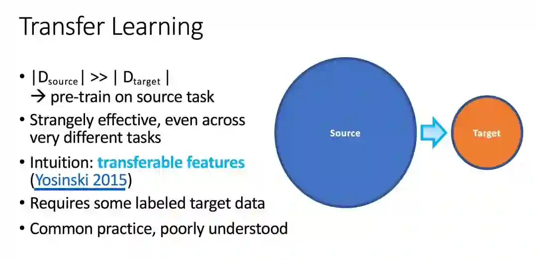 迁移学习,主要是想,在一个拥有大量样本的数据(图中蓝色部分)上去学习模型,在改动较少的情况下,将学习到的模型迁移到类似的目标数据(图中橘色部分)和任务上。