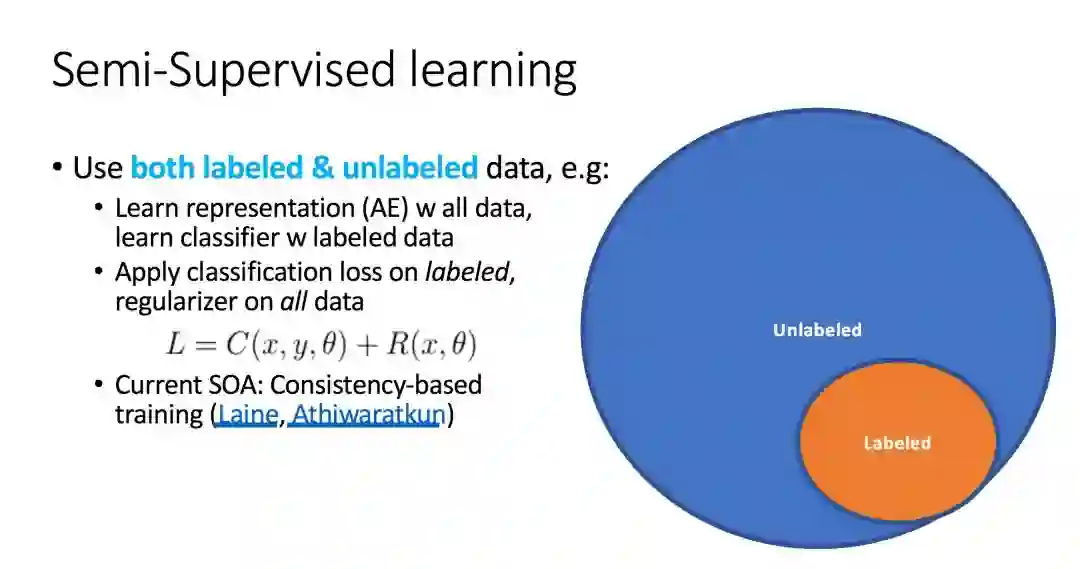 半监督学习,一般的思路是:在全部数据上去学习数据表示,在有标签的样本上去学习模型,用所有数据去加正则。