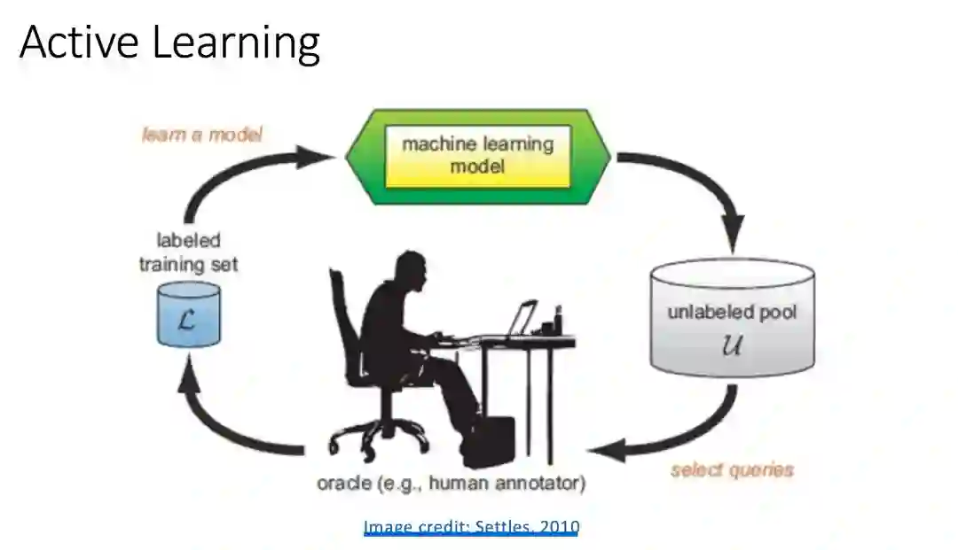 主动学习,维护了两个部分:学习引擎和选择引擎。学习引擎维护一个基准分类器,并使用监督学习算法对系统提供的已标注样例进行学习从而使该分类器的性能提高,而选择引擎负责运行样例选择算法选择一个未标注的样例并将其交由人类专家进行标注,再将标注后的样例加入到已标注样例集中。学习引擎和选择引擎交替工作,经过多次循环,基准分类器的性能逐渐提高,当满足预设条件时,过程终止。