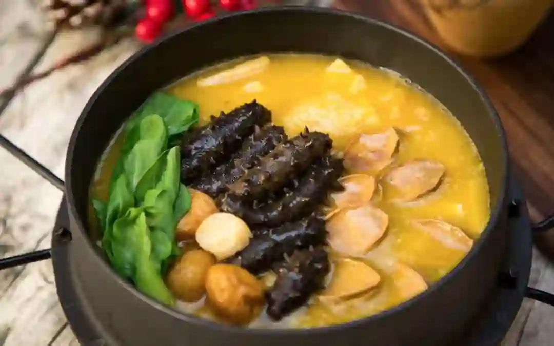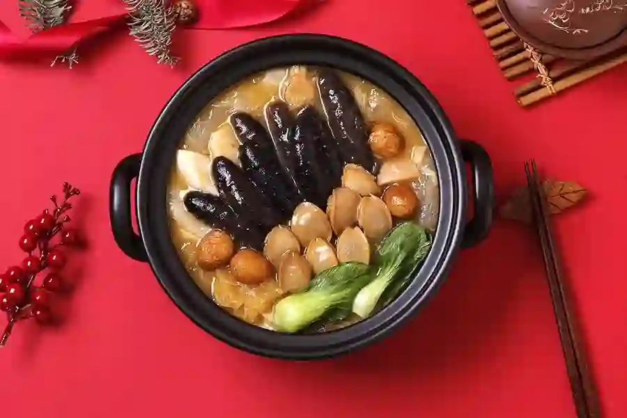 老母鸡,猪蹄,猪皮,猪棒骨,鸡骨等熬制出汤底,集牛筋、鱼肚、螺片、海参、鲍鱼、瑶柱、冬笋、鹌鹑蛋、鸡肉、猪肉等10种新鲜食材于一锅,