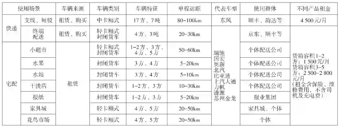 电动物流车根据自身技术特点与使用环境,主要定位在于城市内配送与快递、快运服务,是城市功能的功能型服务终端,是可移动的城市物流小微节点。从目前市场运行车辆的属性看,多为租赁运营模式,究其原因主要是产品购置成本较高、充电设施不健全,产品技术不成熟等方面,随着各方面条件的不断成熟,从产品整体生命周期成本和城市通行限制方面考虑,将会逐步过渡到企业购买模式。通过实地调研将现有电动物流车应用场景归纳如表 2。
