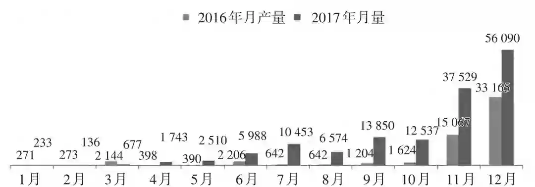 据中国汽车技术研究中心汽车产量数据库资料,2016 年全年累计生产纯电动物流车 58026 台,2017 年全年累计生产 148320 台,2.5倍的增速说明了电动汽车物流车异常火爆。较2016年,2017 年各月份电动物流车的产量数据增长迅速。自 2017 年 4 月份开始,电动汽车物流车产量环比出现正增长;7 月份环比增长百分比达到 1528%;2017 下半年延续此增长状态,11 月份环比增长 149%(图 1)。