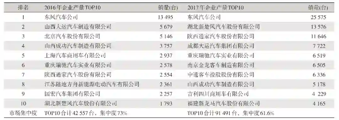 2017 年的企业产量排名与 2016 年发生了很大的变化,除东风继续稳居首位外,其他企业排名变化很大,湖北楚风、陕汽通家 2017 年上升势头明显,预计整年产量破万,市场集中度方面,2016 年 top10 集中度 73%,2017 年变化为 61.6%,市场参与者增加,企业产能提升(见表 1)。