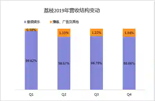 从财报营收组成上看,荔枝的收入模式依然较为单一,荔枝高达98%的营收来自于平台用户打赏主播所获得的收入。
