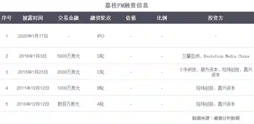 2013年,荔枝产品上线之后,荔枝继续拿到2轮融资:2015年1月,荔枝完成C轮2000万美元融资,经纬创投、晨兴资本继续跟投,这其中新的伙伴加盟,分别为顺为科技和小米科技;2018年1月,荔枝完成IPO前的最后一轮融资,兰馨亚洲和Evolution Media China为荔枝带来5000万美元D轮融资。
