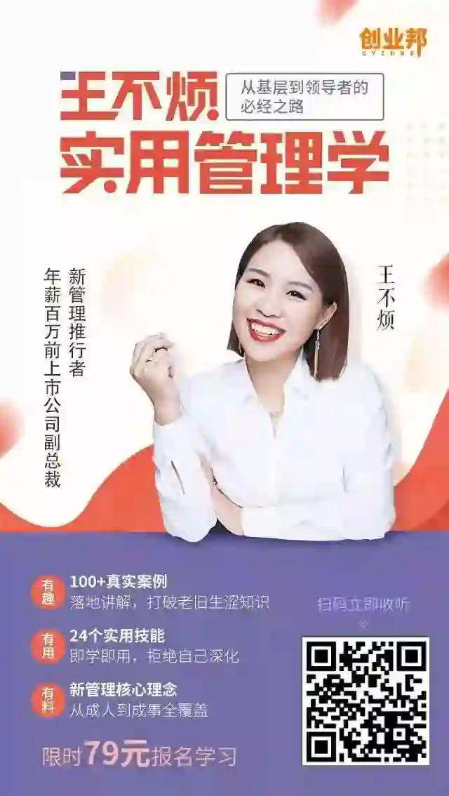 创业邦联合王不烦老师精心制作了这门实用、落地的管理课,让你快速掌握、直接用到工作中,目前双十一活动价仅需79元。