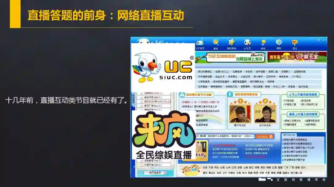 之所以从UC说起,其实就是想说十几年前直播互动类节目就已经有了。到了后来手机直播的时代,就有更多类似的直播综艺节目了。