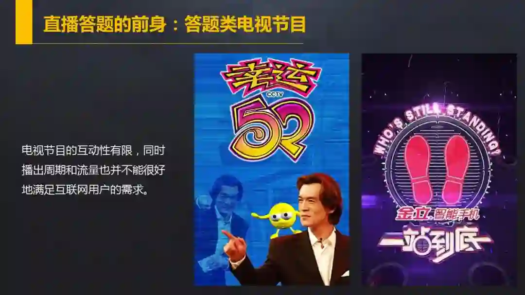 相对来说,电视节目的互动性有限,同时播出周期和流量也并不能很好的满足互联网用户的需求。但每一档答题类的电视节目都有很长的寿命周期。