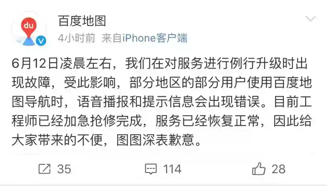上午10时21分,百度地图官方微博对“抽风”进行了回应,称对服务进行例行升级时出现故障,部分地区的部分用户使用百度地图导航时,语音播报和提示信息会出现错误。目前工程师已经加急抢修完成,服务已经恢复正常。