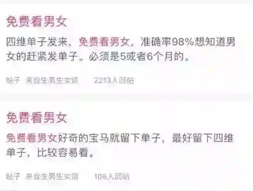 然后我就试着发了一个帖子,免费看男女,准确率99%! 还真别说,真有人问,还有一个人加了我微信。当时高兴死我了。