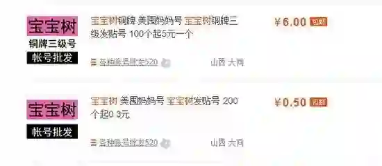 之前看的加粉教程里有说可以买号,于是我去淘宝搜索宝宝树账号,2毛钱一个,我一下子买了1块钱的。(貌似现在涨价了)