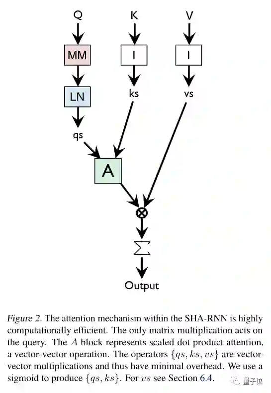 相比之下,SHA-RNN模型的注意力是简化的,只留一个头,唯一的矩阵乘法出现在query (下图Q) 那里,A是缩放点乘注意力 (Scaled Dot-Product Attention) ,是向量之间的运算。