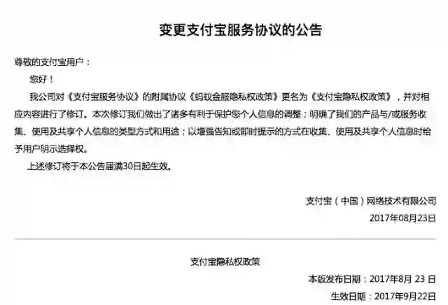 8月23日,支付宝发布了《变更支付宝服务协议的公告》,将《支付宝服务协议》的附属协议《蚂蚁金服隐私权政策》更名为《支付宝隐私权政策》,新规定将于9月22日生效,并对相应内容进行了修订,: