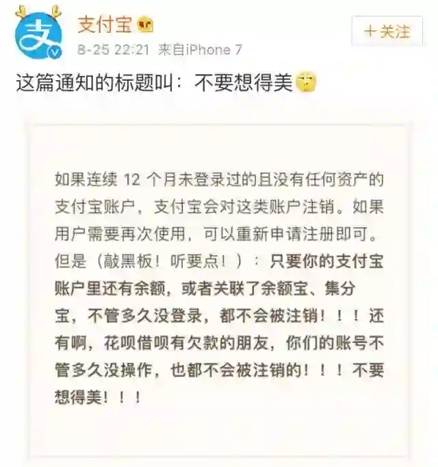 8月25日晚22:21,支付宝官方微博还发布了一条通知,标题就叫做“不要想得美”,表示“花呗借呗有欠款的朋友,你们的账号不管多久没操作,也不会被注销的”。