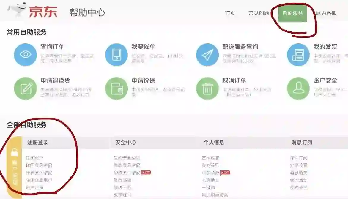 点击“帮助中心”后,页面跳转至京东帮助中心。此时,需要再点击导航栏中的“自助服务”,即可看见“账户管理”栏目的“账户注销”选项。