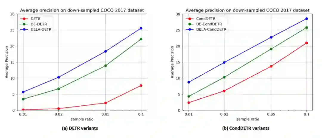 此外我们对 COCO 2017 中的训练数据进行训练图像 0.1,0.05,0.02 和 0.01 倍的采样,来观察模型在不同数据量下的性能。如图 4 所示,在不同的训练数据量下,我们的方法始终能够取得显著优于基线方法的性能。特别的,仅用 0.01 倍的数据 DELA-DETR 的性能显著优于使用五倍数据的 DETR 基线。类似的,DELA-CondDETR 性能始终优于用两倍数据训练的 CondDETR 基线。