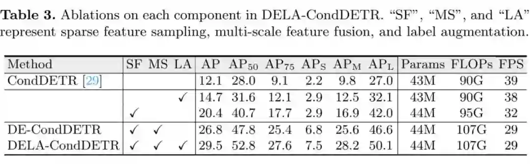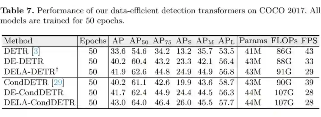 尽管以上实验说明了我们的方法能够在数据量有限的情况下显著提升模型性能,它并不能表明我们的方法在数据量充足时依然有效。为此,我们在数据量充足的 COCO2017 上测试我们方法的性能。有趣的是,我们的方法不仅不会降低模型在 COCO 2017 上的性能,还能带来不小的提升。具体来说,DELA-DETR 和 DELA-CondDETR 分别相较于它们的 baseline 提升 8.1A P和 2.8AP。