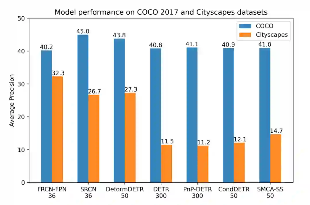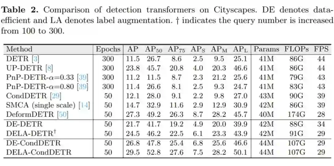 (约 3k 训练图像)上,尽管 Faster RCNN 能够稳定的取得优良的性能,大多数 Detection Transformers 的性能显著下降。并且尽管不同 Detection Transformers 在 COCO 数据集上性能差异不到 2AP,它们在小数据集 Cityscapes 上的性能有大于 15AP 的显著差异。