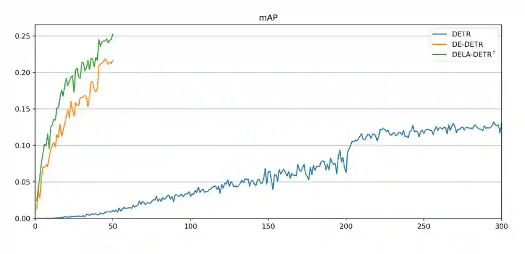 同样的,我们的方法也能够与其他 Detection Transformer 结合来显著提升其 data efficiency,例如我们的 DE-DETR 和 DElA-DETR 能够在以仅仅 50 周期取得比 DETR 500 个周期要显著优越的性能。