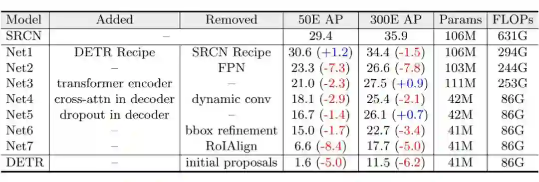 ▲ 表1:从SparseRCNN(表中缩写为SRCN)到DETR的模型转化