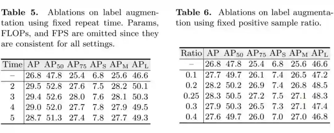 如方法部分中讨论的,我们考虑了两种标签增强策略。包括固定重复次数和固定正负样本比例。在本部分,我们对这两种策略进行消融。如上表中左表所示,使用不同的固定重复倍数均能够提升 DE-DETR 的性能,但随重复次数增加,性能提升呈下降趋势。我们默认采用重复正样本标签 2 次。
