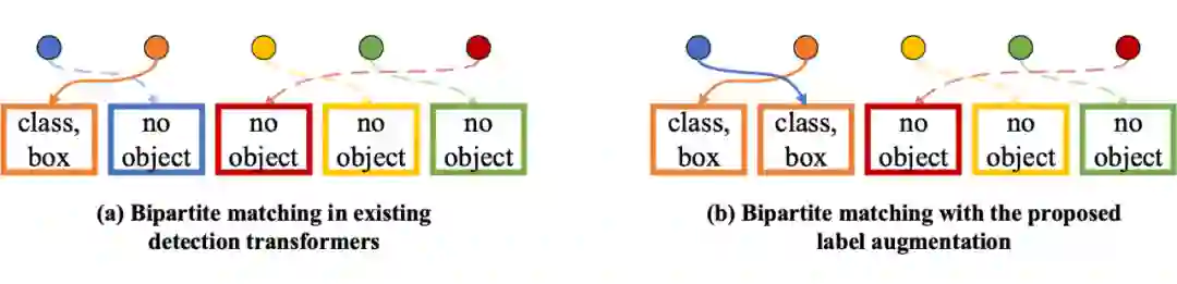 ▲ 图3:(a) 现有Detection Transformer的标签分配方式;(b) 使用标签增强后的标签分配。圆圈和矩形框分别表示模型的预测和图片上的物体标注。通过复制橙色方框表示的物体标注,蓝色圆圈表示的模型预测也在标签分配中匹配到了正样本,因此得到了更丰富的监督信号。