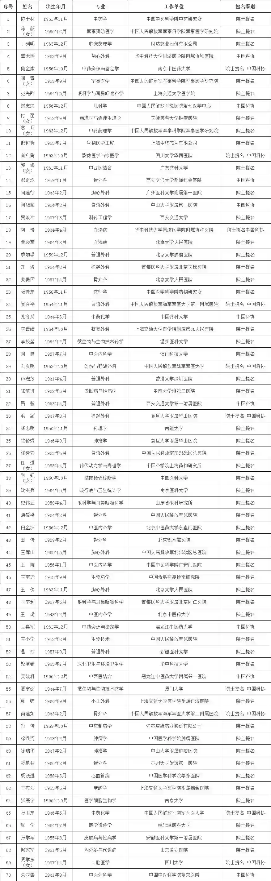 在这70人中,由院士与中国科协共同提名为10人,由中国科协单独提名的为9名,由院士单独提名的为51名。