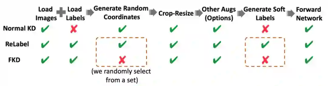 除了上述介绍的采用多个 crops 来进行加速外,作者还分析了其他一些加速的因素,如下图所示,ReLabel 在训练模型阶段需要生成采样数据的坐标,同时需要使用 RoI-Align 和 Softmax 来生成所需的软标签,相比而言,FKD 直接保存了坐标信息和最终软标签格式,因此读取标签文件之后不需要做任何额外的后处理就可以直接训练,速度相比 ReLabel 也会更快。