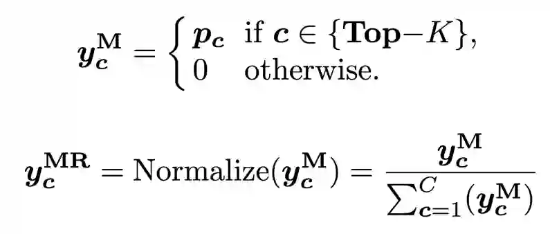 4)边际平滑归一化 (Marginal Re-Norm with Top-K)。边际平滑归一化策略会将 Top-K 预测值重新归一化到和为 1,并保持其他元素值为零(FKD 使用归一化来校准 Top-K 预测值的和为 1,因为 FKD 存储的软标签是 softmax 处理之后的值):