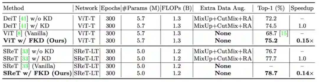 接下来作者展示了在 vision transformer 上的结果,在不使用额外数据增强的情况下,FKD 就可以比之前知识蒸馏方法得到将近一个点的提升,同时训练速度快了 5 倍以上。