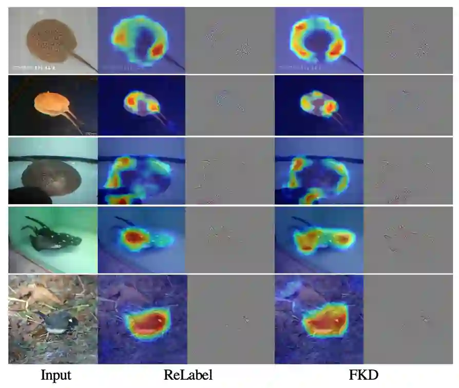 (iii)ReLabel 的注意力可视化图与 PyTorch 预训练模型更加接近,而 FKD 的结果跟他们相比具有交大差异性。这说明 FKD 方式学习到的注意力机制跟之前模型有着显著的差别,从这点出发后续可以进一步研究其有效的原因和工作机理。