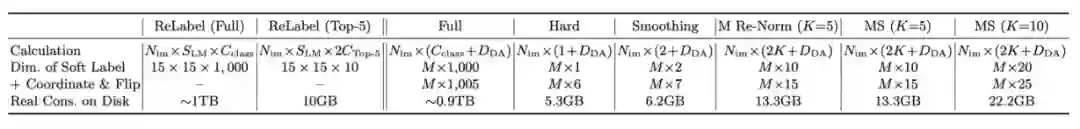 不同标签压缩方法需要的存储空间如下表格所示,所使用的数据集为 ImageNet-1K,其中 M 是软标签生成阶段每张图像被采样的数目,这里作者选取了 200 作为示例。Nim 是图像数量, ImageNet-1K 数据集为 1.2M,SLM 是 ReLabel 标签矩阵的大小,Cclass 是类的数量,DDA 是需要存储的数据增强的参数维度。
