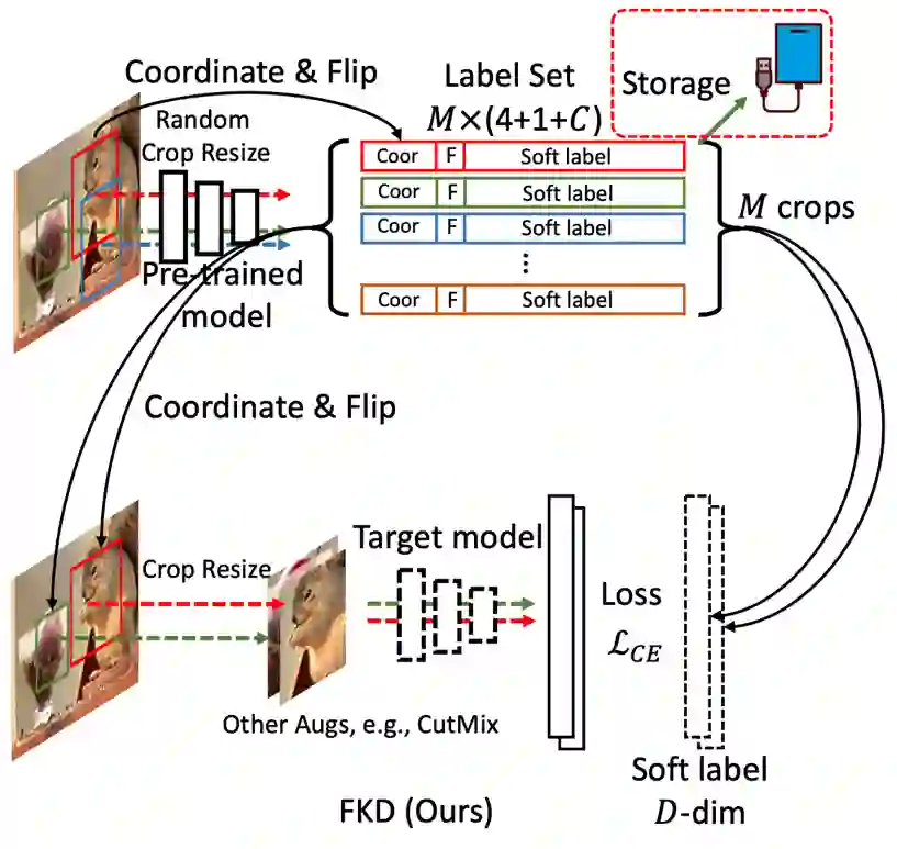 如图所示,上半部分展示了软标签的生成过程,作者通过输入多个 crops 进入预训练好的 teacher 来产生需要的软标签向量,同时作者还保存了:(1)每个 crop 对应的坐标和(2)是否翻转的 Boolean 值。下半部分展示了 student 训练过程,作者在随机采样图片的时候同时也会读取它们对应的软标签文件,从中选取 N 个 crops 用于训练,额外数据增强比如 mixup,cutmix 会放在这个阶段,从而节省了由于引入更多数据增强参数带来的额外存储开销。