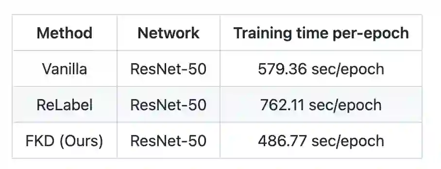 作者在实验部分跟标准的训练方式以及 ReLabel 训练进行了速度的比较,结果如下表格所示:可以看到,相比正常的分类框架,FKD 会快 16% 左右,而相比 ReLabel 则快了 30%,因为 ReLabel 相比正常训练需要读取双倍的文件数目。需要注意的是这个速度对比实验中,FKD crop 数目为 4,如果选取更大的 crop 数目可以得到更高的加速比。