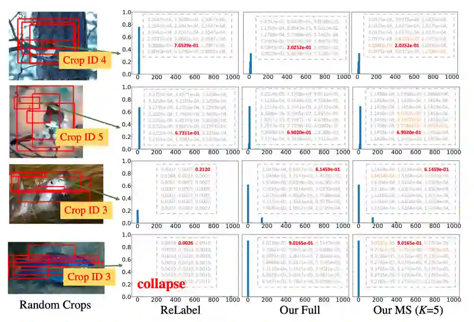 (第一行)FKD 相比 ReLabel 置信度更加平均也与输入样本内容更加一致,作者分析原因是 ReLabel 将全局图像输入到模型中,而不是局部区域,这使得生成的全局标签映射编码了更多全局类别信息同时忽略了背景信息,使得生成的软标签过于接近单个语义标签。