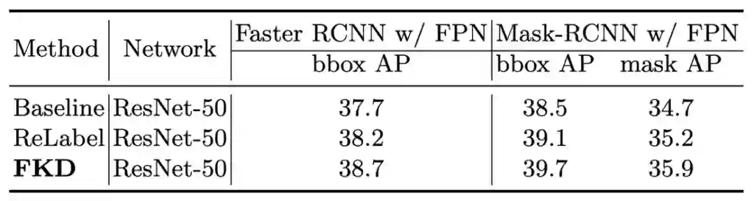 下表是 FKD 预训练模型在 COCO 目标检测任务上的结果,提升同样明显。
