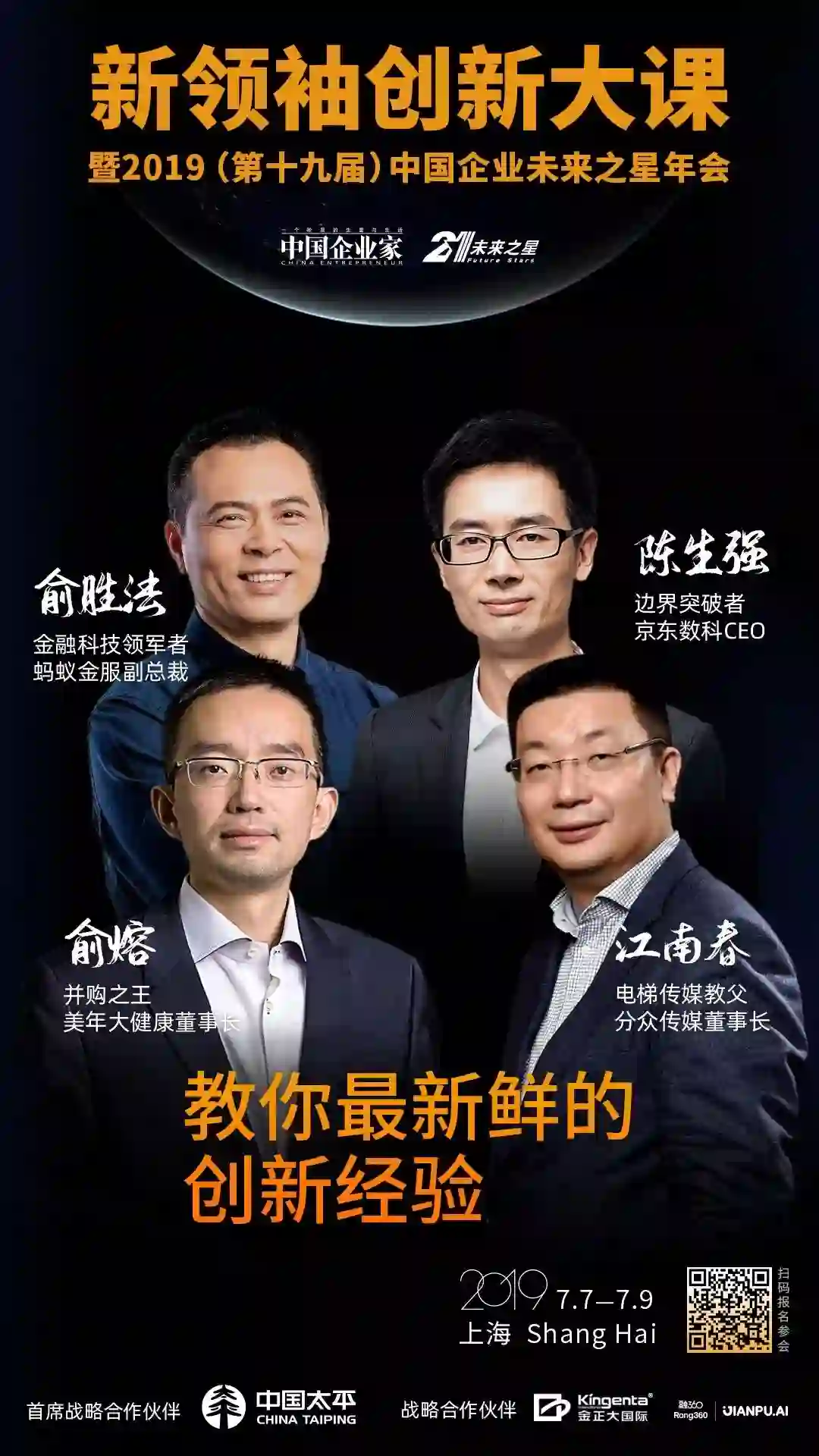 7月7日至9日,新领袖创新大课暨2019(第十九届)中国企业未来之星年会将在上海举行。2天4大模块18堂创新大课,半天新领袖标杆企业实地拜访、高管团队私密分享,就等你来。点击下图直接报名 ▼▼▼