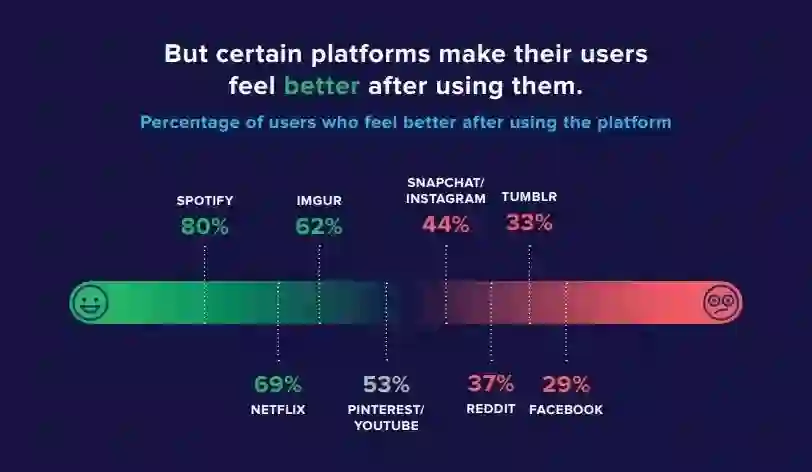 Imgur的匿名性促成了它的成功,在Instagram、Facebook等社区,用户会尝试塑造完美形象,而匿名社区Imgur和Reddit中才会出现真实的自己。据调查,多数用户希望查看自己关注而非算法推荐的内容,也希望使用的社区更加真实,以内容为驱动,62%Imgur用户会在使用过后感觉更开心,该比例仅次于Spotify和Netflix,而Snapchat、Facebook等社交软件则让人越用越不爽。