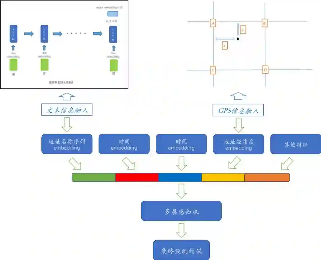 所以整体的设计思路为:利用深度学习融合非数值型特征,在简单Fusion的基础上,直接得到输出结构,对于组件的选择,尽可能选用Flops较低的设计。该设计背后意图是,在充分使用原始输入信息,在尽可能避免信息损失的基础上,将非数值型的信息融入进去。并将信息充分融合,直接对接所需要的目标。而选用的融合组件结构尽可能保证高性能,且具备较高学习效率。这里分别针对地址选用了较为Robust的LSTM,针对GPS选用了自定义的双线性Embedding,兼顾性能和效果。