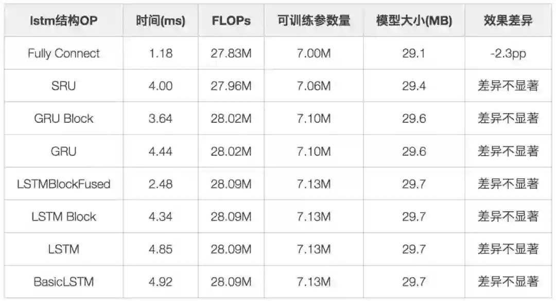 从评估中可以发现,全连接层速度最快,但是对于序列处理会损失2.3pp效果,其余的序列模型效果差异不大,但不同的OP实现对结果影响较大。原生的BasicLSTM性能较差,contrib下的LSTMBlockFusedCell性能最好,GRU/SRU在该场景下未取得显著优势。