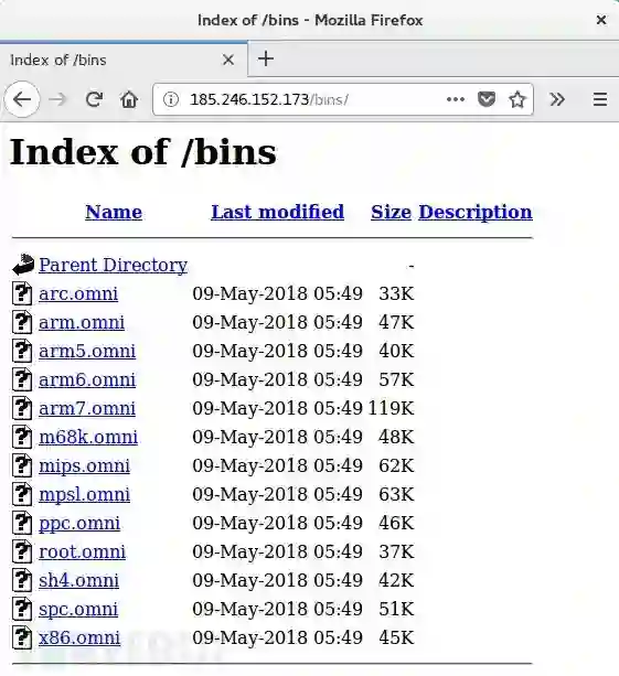 然而,在分析时,在网站目录中找不到Owari bot样本。在另一轮事件中,它们被下面所示的示例所取代,这些样本后来被发现是Omni bot。