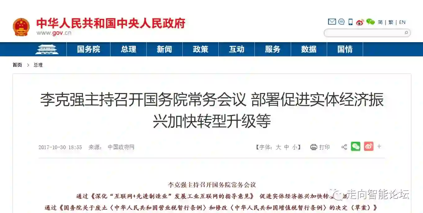 日前,李克强总理主持召开国务院常务会议,通过《深化“互联网+先进制造业”发展工业互联网的指导意见》,促进实体经济振兴、加快转型升级。本文来自:中国政府网,由《走向智能论坛》微信公众号推荐阅读。