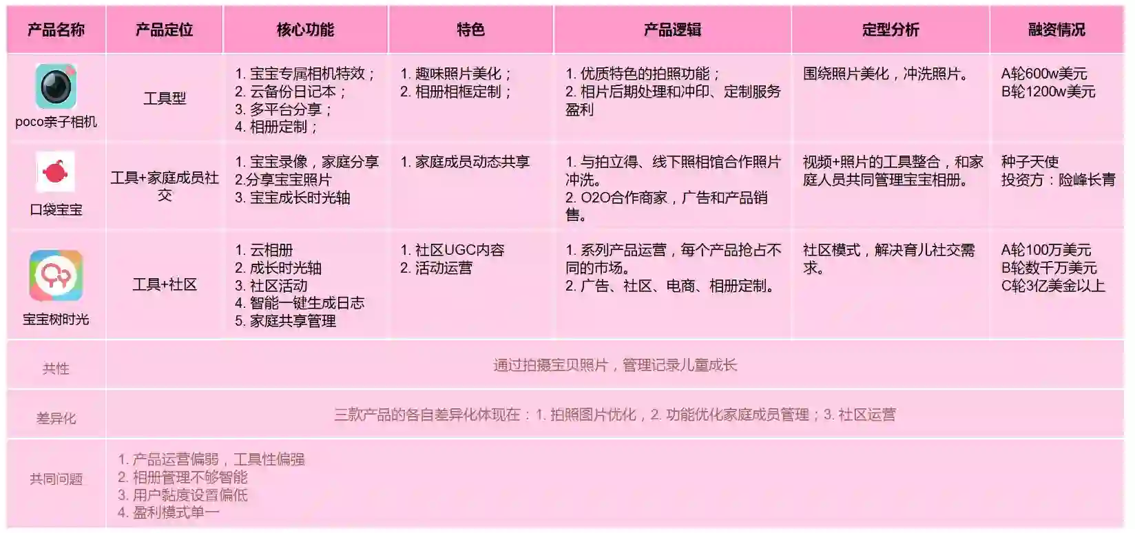 分析维度:产品定位、产品主要功能、差异化亮点、盈利模式及盈利逻辑(定型分析)、市场数据(或融资情况)