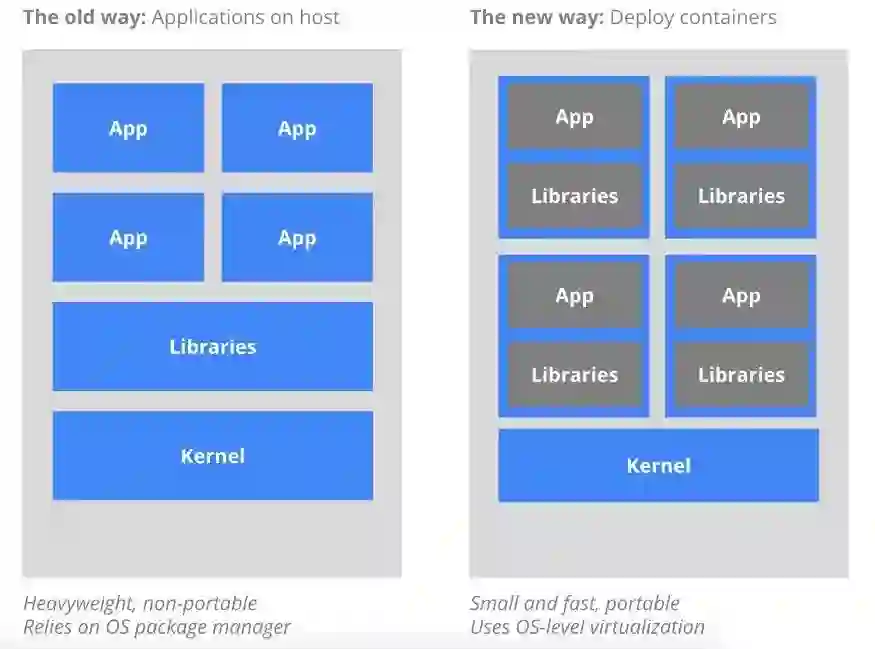 程序部署的传统方法是指通过操作系统包管理器在主机上安装程序。这样做的缺点是,容易混淆程序之间以及程序和主机系统之间的可执行文件、配置文件、库、生命周期。为了达到精准展现和精准回撤,你可以搭建一台不可变的虚拟机镜像。但是虚拟机体量往往过于庞大而且不可转移。