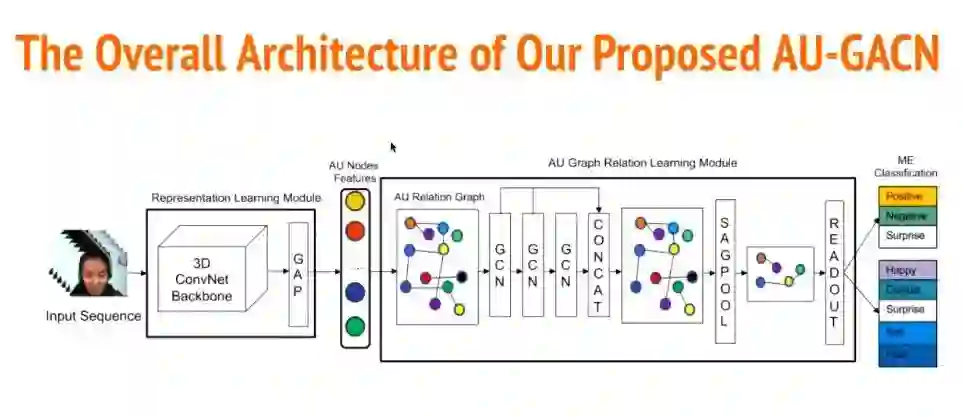随后,谢洪霞进一步介绍了后续开展的基于GCN的微表情AU相关特征提取的研究,提出了如下图所示的AU-GACN 网络。首先通过3D-Conv网络输出微表情片段的AU节点特征,进而通过AU的图相关学习模型提取有用的AU节点信息,最终实现微表情的情感分类。